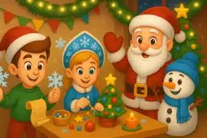 Всё завершается встречей с Дедом Морозом, весёлым хороводом и праздничным сюрпризом.
