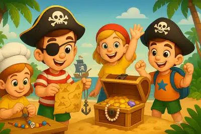 Как проходит: Ребята выбирают бусины, нанизывают их в нужной последовательности, придумывают значение амулета (“от штормов”, “для храбрости”). Затем ведущий рассказывает короткую легенду о пиратских талисманах, и каждый получает “пиратскую силу” своего амулета.